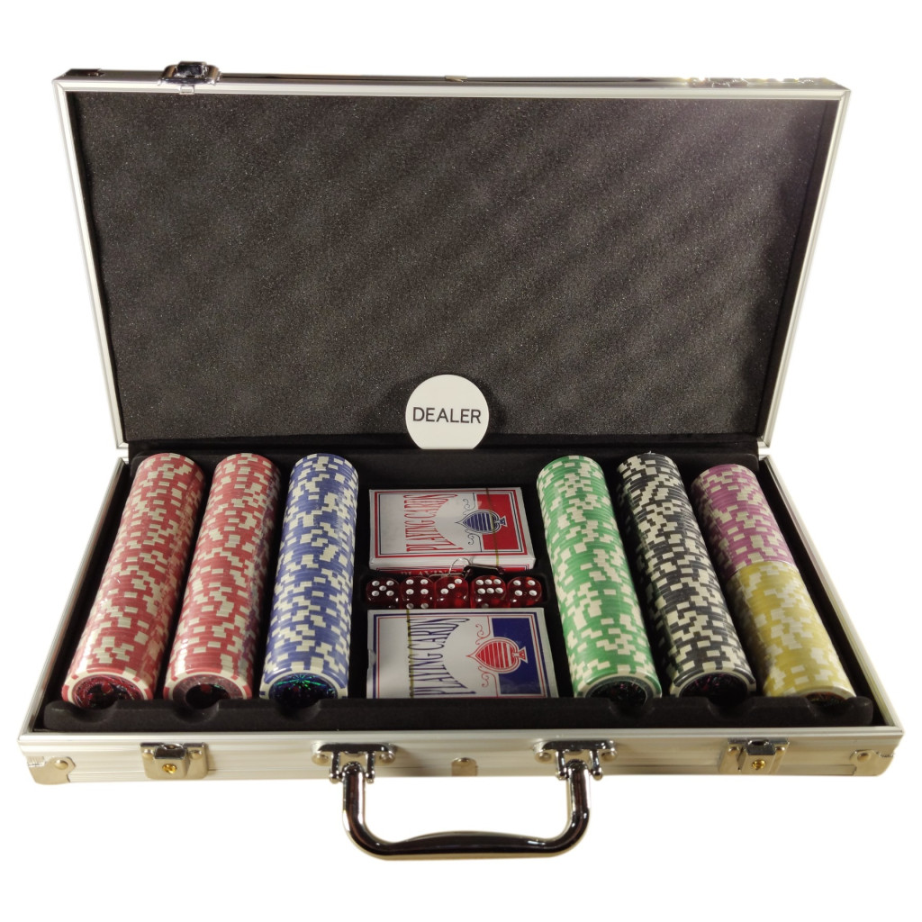 Teljes partykészlet 300 zsetonnal, 2 paklival, dobókockákkal és praktikus kofferrel. Ideális otthoni játékhoz és közös estékhez.