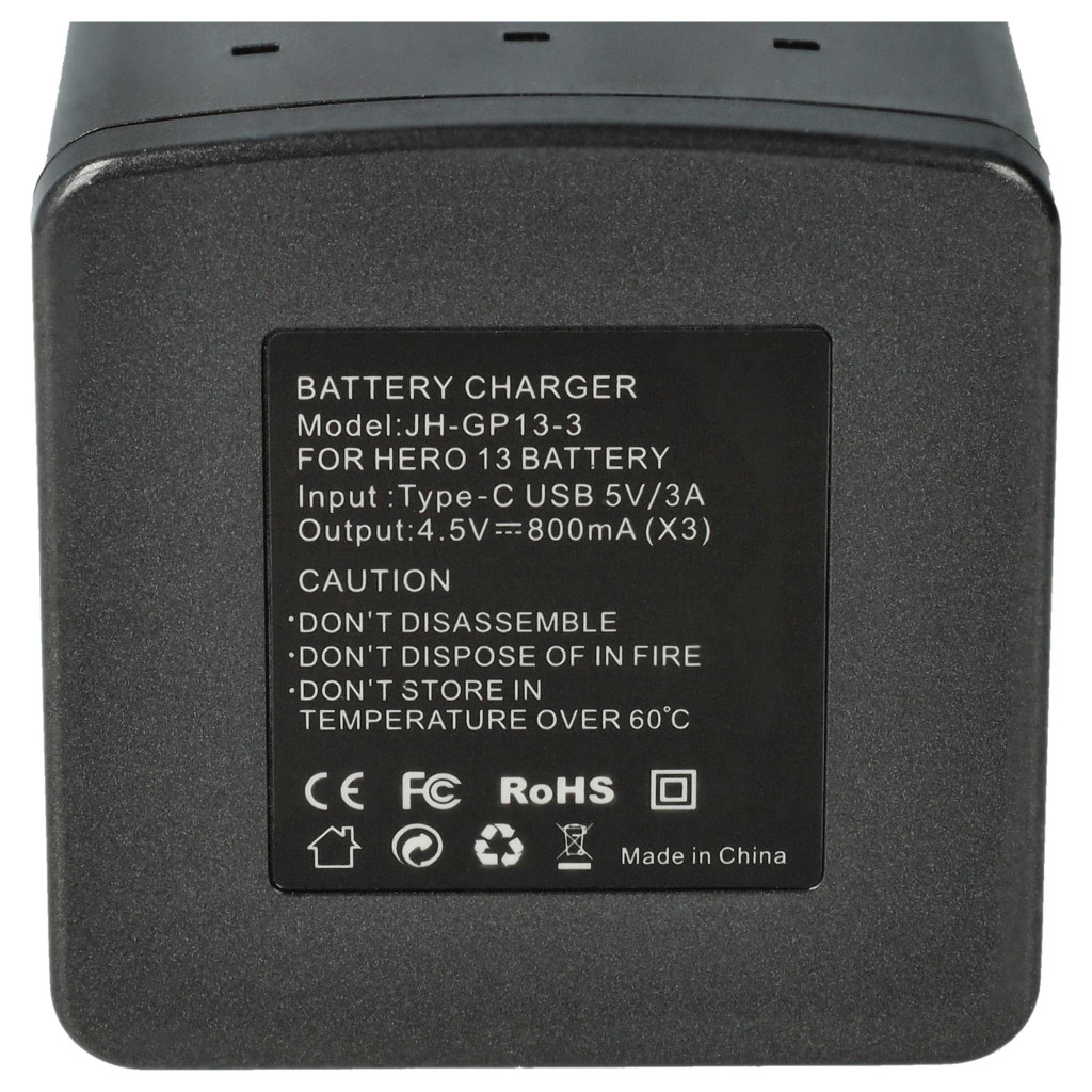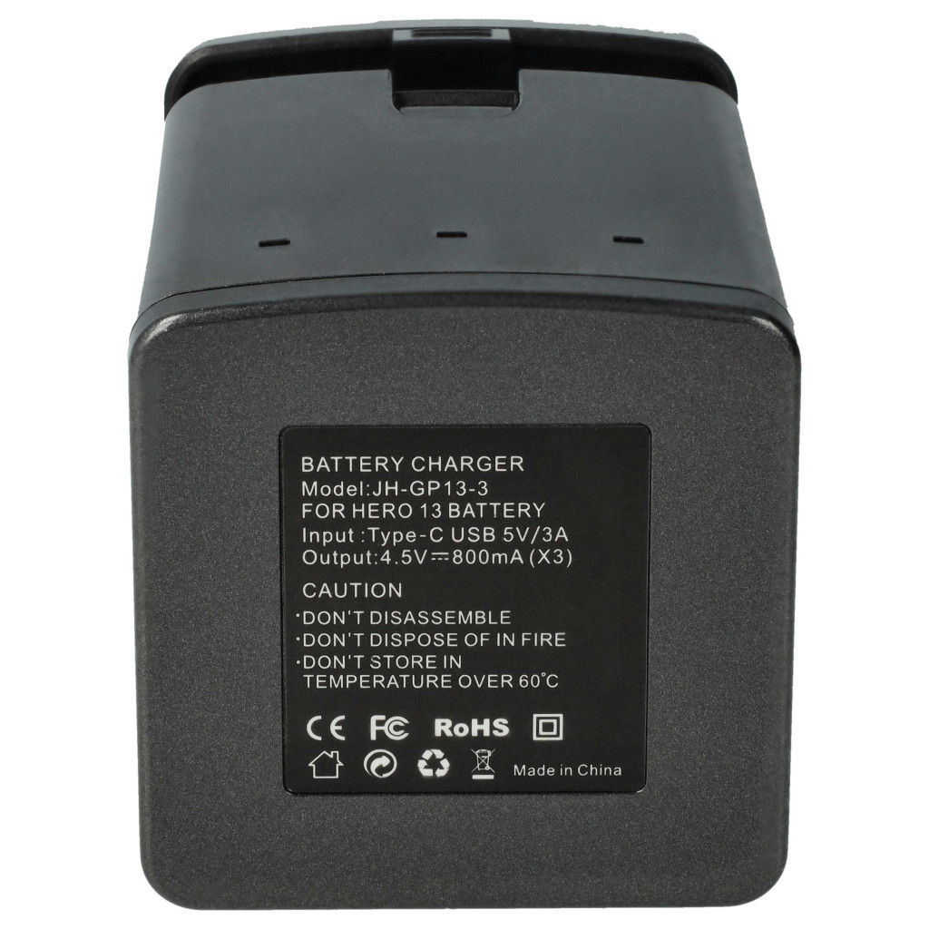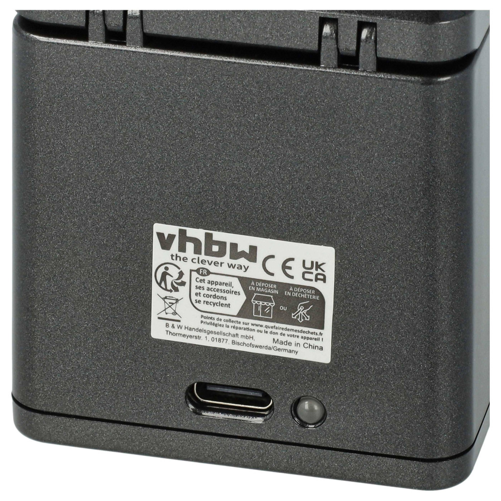 Márka: vhbw; Anyag: műanyag; Szín: fekete; Súly: 77 g; Méretek: 7,3 x 5,7 x 5,2 cm; Csatlakozások: 1x USB C port (töltőállomás), USB type C dugó, USB type A dugó (kábel); Kábel hossza: 75 cm; Hálózati adapter bemenet: 5 V, 3 A; Kimeneti feszültség: 4,5 V / 0,8 A; Kimeneti áram: max. 0,8 A; Akkumulátorhelyek száma: 3; LED-ek száma: 4; LED töltésjelző: tartalmazza
