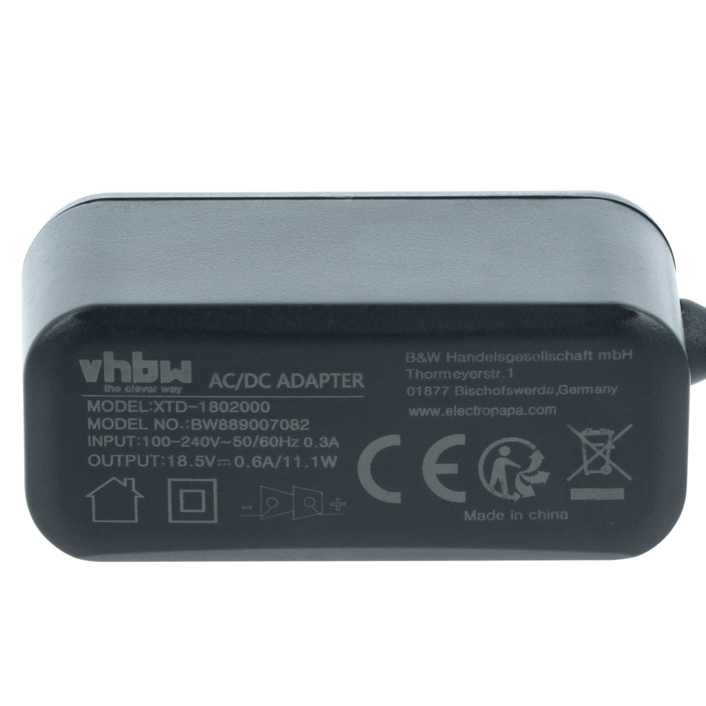 Anyag: műanyag / fém; Szín: fekete; Tömeg: 67 g; Méretek (H x Sz x Ma): 190 x 7,2 x 2,7 cm; Csatlakozók: 1 db Euro dugó (90° szögben), 1 db készülékspecifikus dugó; Üzemi frekvencia: 50-60 Hz; Bemeneti feszültség: 100 - 240 V, 0,3 A; Kimeneti feszültség: 18,5 V / 0,6 A; Kimeneti áram: max. 0,6 A; Kimeneti DC: 18,5 V / 0,6 A; Teljesítmény: 11,1 W; Csatlakozó típusa: C típusú (CEE 7/16) „Euro dugó”; Szállítás tartalma: 1 db hálózati adapter