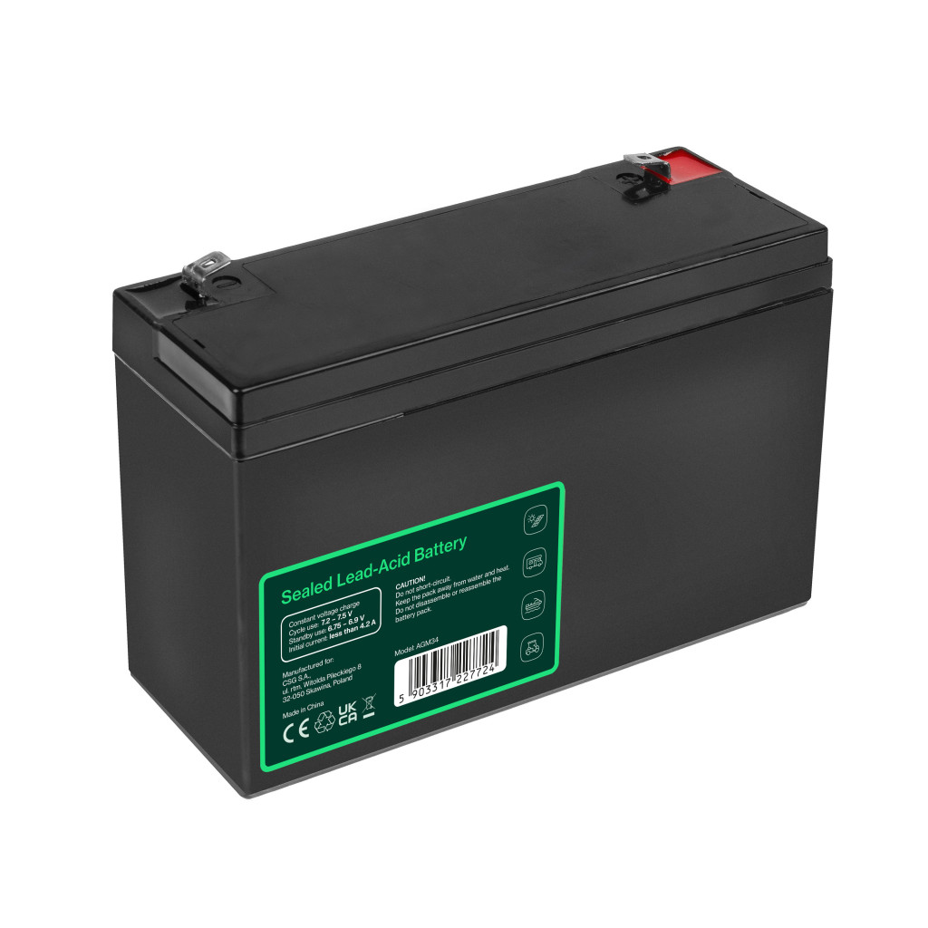 Spannung: 6V | Kapazität: 14Ah | Garantie: 24 Monate | Typ: VRLA AGM | Produktcode: AGM34 | Hersteller: Green Cell | Größe: 151 x 50 x 100 mm | Gewicht: 1.7 kg | Anschluss: Faston 187 (F1) | Lebensdauer: 5 Jahre | Max. Entladestrom: über C / 3