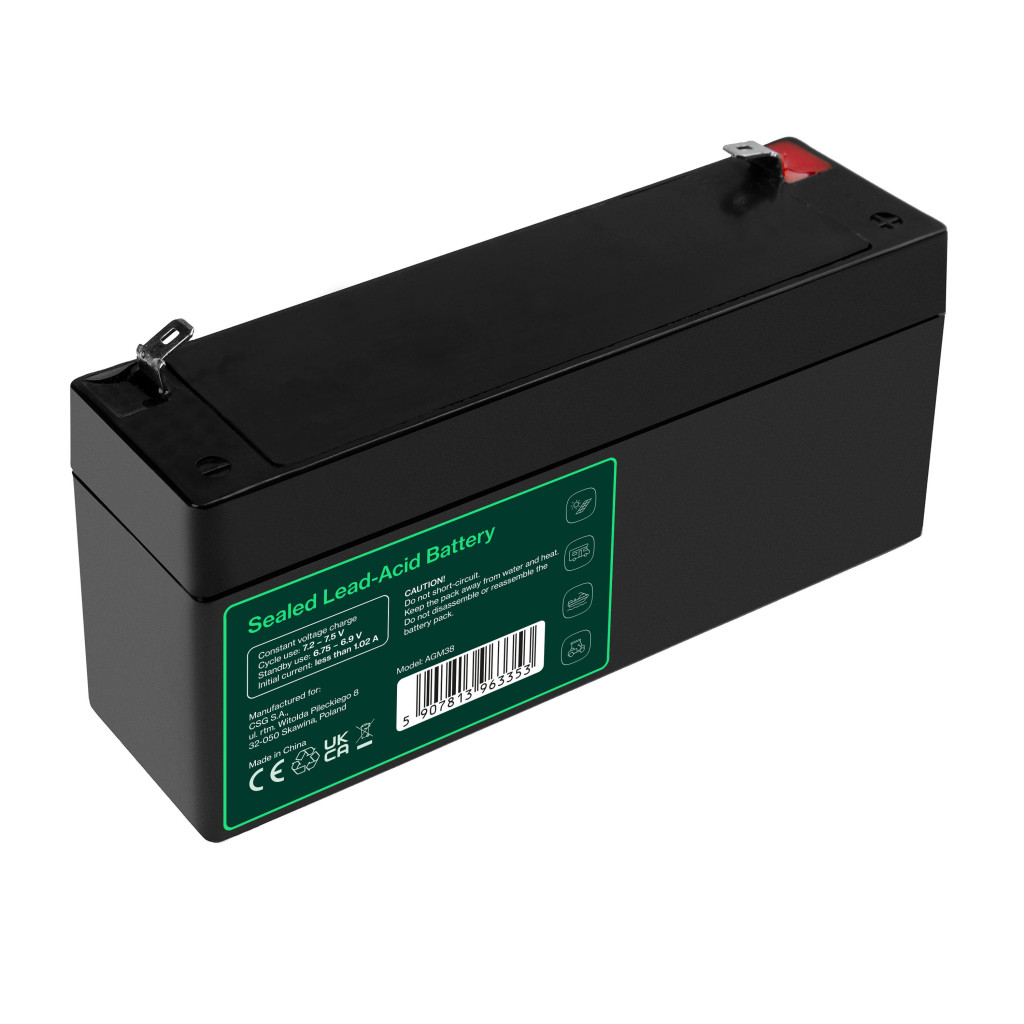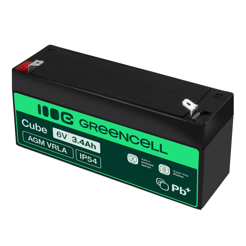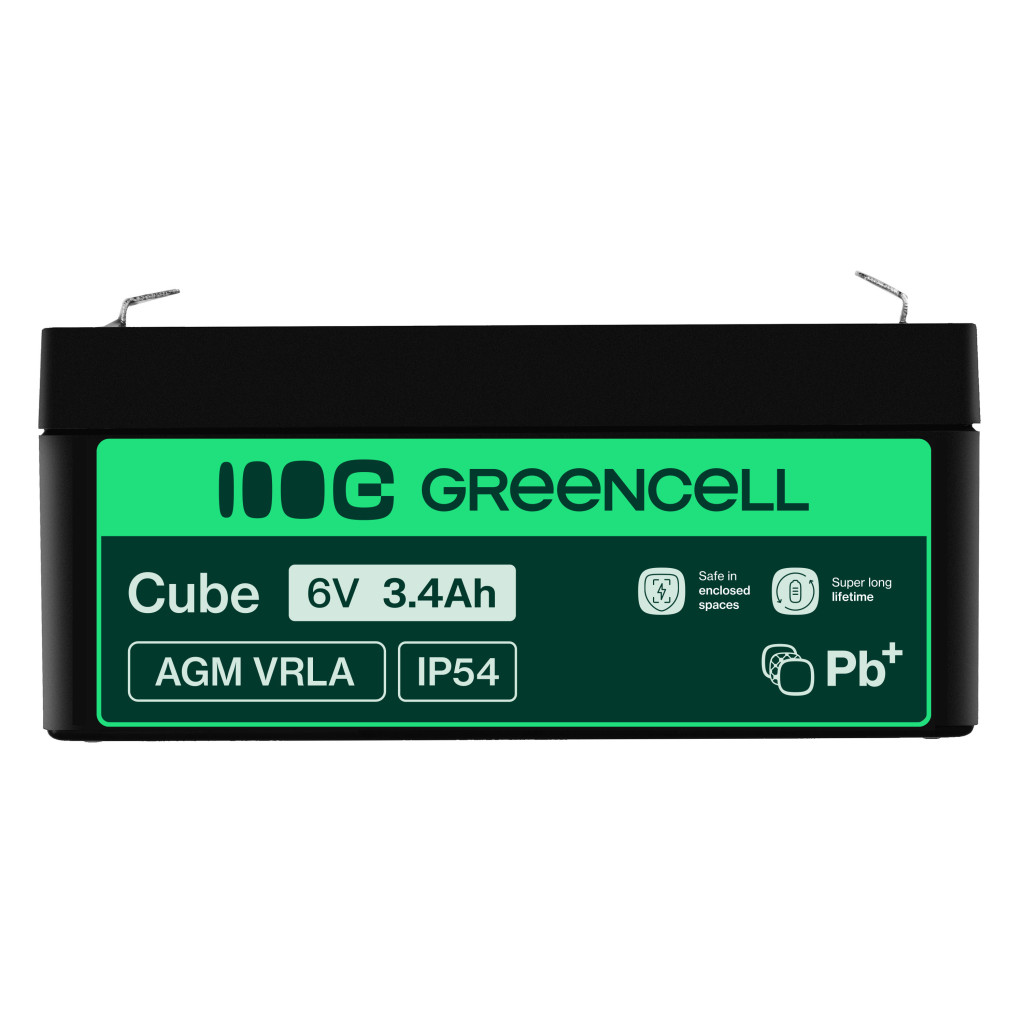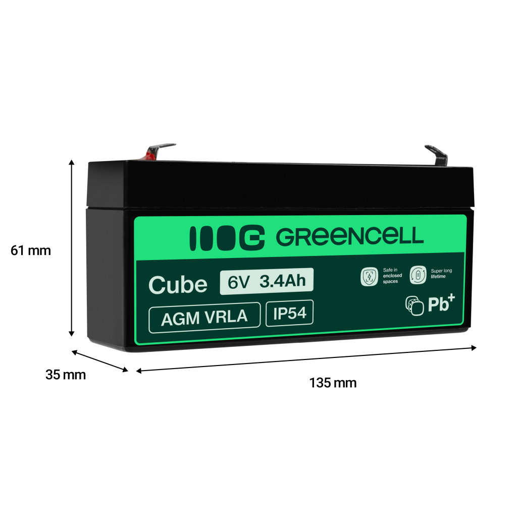 Spannung: 6V | Kapazität: 3.4Ah | Garantie: 24 Monate | Typ: VRLA AGM | Produktcode: AGM38 | Maße: 135 x 35 x 61 mm | Hersteller: Green Cell | Gewicht: 0.6 kg | Anschluss: Faston 187 (F1) | Lebensdauer: 5 Jahre
