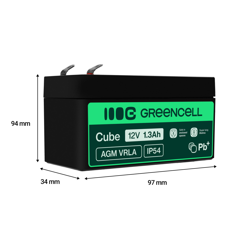 Spannung: 12V | Kapazität: 1.3Ah | Garantie: 24 Monate | Typ: VRLA AGM | Produktcode: AGM41 | Abmessungen: 97 x 43 x 52 mm | Hersteller: Green Cell | Gewicht: 0.53 kg | Anschluss: Faston 187 (F1) | Lebensdauer: 5 Jahre
