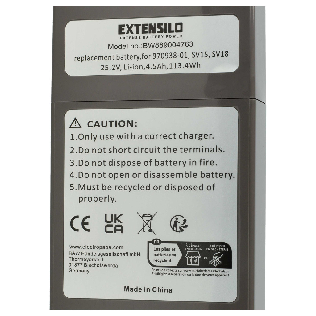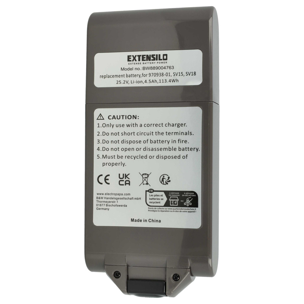 Kompatibler Akku, der Ihrem Dyson-Reinigungsgerät neues Leben einhaucht. Hochwertiges Ersatzteil mit optimalem Preis-Leistungs-Verhältnis. Zuverlässiger Betrieb und vollständige Kompatibilität mit Ihrem Staubsauger. Präzise Fertigung für die perfekte Passform. CE- und RoHs-Zertifizierung - erfüllt alle Richtlinien zur Betriebssicherheit. Kein Memory-Effekt. Ist der Akku auch kompatibel, wenn die Kapazität unterschiedlich ist? Ja! Wenn die anderen technischen Spezifikationen, wie Spannung und Anschlüsse, korrekt sind, ist der Akku kompatibel. Die Akkukapazität wird in Milliamperestunden (mAh) gemessen. Wenn der Ersatzakku eine höhere Kapazität hat als das Original, bietet er eine längere Betriebszeit. Wenn die Kapazität nur geringfügig höher oder niedriger ist, hat dies keinen signifikanten Einfluss auf die Betriebszeit. Sie können problemlos Akkus mit unterschiedlichen Kapazitäten verwenden. Hochwertige Li-Ion-Zellen für optimale Geräteleistung. Lithium-Ionen-Akkus haben eine hohe Energiedichte und gehören zu den leistungsstärksten Akkus. Im Vergleich zu NiMH-Akkus haben sie eine niedrige Selbstentladungsrate und leiden nicht unter dem Memory-Effekt. Sie benötigen keine regelmäßige Entladung, wodurch sie wartungsarm sind. Bei richtiger Lagerung haben diese wiederaufladbaren Akkus eine lange Lebensdauer, sind langlebig und haben eine hohe Ladezyklenanzahl. Li-Ion-Akkus werden in verschiedenen tragbaren Geräten verwendet, die einen hohen Energiebedarf haben, wie Smartphones, Notebooks, Kameras und Elektrowerkzeuge. Diese Akkus können auch in funkferngesteuerten Modellen und Telekommunikationsanwendungen eingesetzt werden. Zur Produktsicherheit: Dieses Produkt wurde gemäß den geltenden Vorschriften der EU hergestellt. Unter anderem erfüllt es die Anforderungen der Richtlinie 2011/65/EU (RoHS) und der CE-Kennzeichnung. Die Herstellung erfolgt unter Einhaltung der relevanten Vorschriften zur Produktsicherheit, Umweltverträglichkeit und Qualitätssicherung. CE- und RoHs-Zertifizierung - erfüllt alle Richtlinien zur Betriebssicherheit. Kompatible Geräte: Dyson SV15, Dyson SV17, Dyson SV18, Dyson V11 2020, Dyson V11 2020 Outsize, Dyson V11 Absolute+, Dyson V11 Absolute Extra, Dyson V11 Absolute Extra +, Dyson V11 Absolute Extra Pro, Dyson V11 Animal, Dyson V11 Click-In, Dyson V11 Complete Extra, Dyson V11 Fluffy Extra, Dyson V11 Torque Drive Extra, Dyson V11 Torque Size, Dyson V11 V11, Dyson V15 Detect, Dyson V15 Detect Absolute Extra, Dyson V15 Detect Total Clean SV22, Dyson V15s Submarine