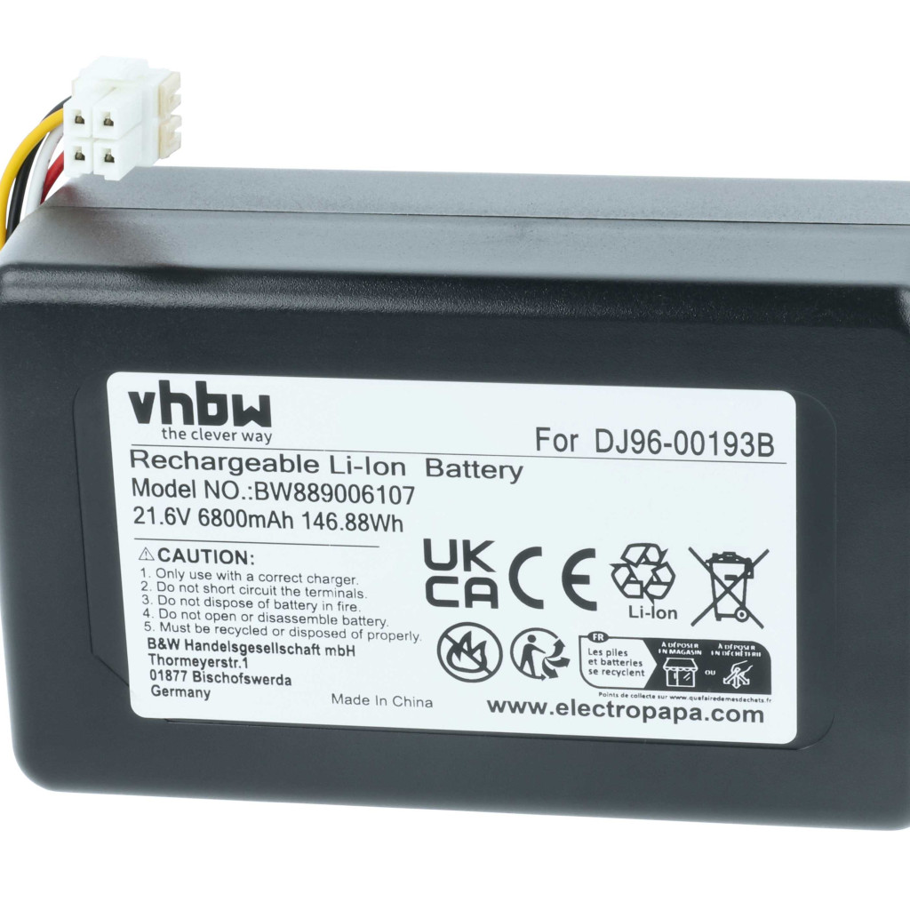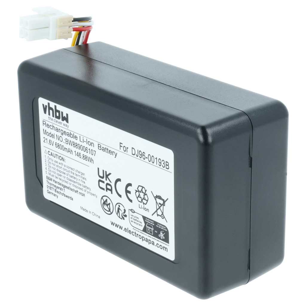 Kompatibler Akku, der Ihrem Samsung-Reinigungsgerät neues Leben einhaucht. Hochwertiges Ersatzteil mit optimalem Preis-Leistungs-Verhältnis. Zuverlässige Funktionalität und vollständige Kompatibilität mit Ihrem Saugroboter. Präzise Fertigung für eine perfekte Passform. CE- und RoHS-Zertifizierung - erfüllt alle Richtlinien zur Betriebssicherheit. Kein Memory-Effekt. Ist der Akku auch kompatibel, wenn die Kapazität anders ist? Ja! Wenn die anderen technischen Spezifikationen, wie Spannung und Anschlüsse, stimmen, ist der Akku kompatibel. Die Akkukapazität wird in Milliamperestunden (mAh) gemessen. Wenn der Ersatzakku eine höhere Kapazität hat als das Original, bietet er eine längere Betriebszeit. Wenn die Kapazität nur geringfügig höher oder niedriger ist als die des Originalakkus, hat dies keinen signifikanten Einfluss auf die Betriebszeit. Sie können Akkus mit unterschiedlicher Kapazität problemlos verwenden. Hochwertige Li-Ion-Zellen für optimale Geräteleistung. Lithium-Ionen-Akkus haben eine hohe Energiedichte und gehören zu den leistungsstärksten Akkus. Im Vergleich zu NiMH-Akkus haben sie eine niedrige Selbstentladungsrate und sind nicht vom Memory-Effekt betroffen. Sie erfordern keine regelmäßige Entladung, wodurch sie wartungsarm sind. Bei richtiger Lagerung sind diese wiederaufladbaren Akkus langlebig, robust und halten viele Ladezyklen aus. Li-Ion-Akkus werden in verschiedenen tragbaren Geräten verwendet, die einen hohen Energiebedarf haben, wie Smartphones, Notebooks, Kameras und Elektrowerkzeuge. Diese Akkus können auch in funkferngesteuerten Modellen und Telekommunikationsanwendungen eingesetzt werden. In Bezug auf die Produktsicherheit: Dieses Produkt wurde gemäß den in der EU geltenden Vorschriften hergestellt. Unter anderem erfüllt es die Anforderungen der Richtlinie 2011/65/EU (RoHS) und der CE-Kennzeichnung. Die Herstellung erfolgt unter Einhaltung der relevanten Vorschriften zur Produktsicherheit, Umweltverträglichkeit und Qualitätskontrolle. Kompatible Geräte: Samsung Powerbot R7040, Samsung Powerbot R7065, Samsung Powerbot R7070, Samsung Powerbot R7090, Samsung Powerbot SR20J9259U, Samsung Powerbot SU20J9259U, Samsung Powerbot VR1AM7010U5/AA, Samsung Powerbot VR1AM7010UW/AA, Samsung Powerbot VR1AM7040W9/AA, Samsung Powerbot VR1AM7040WG/AA, Samsung Powerbot VR2AJ9250WW/AA, Samsung Powerbot VR2AM7065WS/AA, Samsung Powerbot VR2AM7070WS/AC, Samsung Powerbot VR2AM7090WD/AA, Samsung Powerbot VR20J9250UC/EN, Samsung Powerbot VR20J9250UK/SA, Samsung Powerbot VR20J9259UC/EG, Samsung Powerbot VR20J9259UK/SW, Samsung Powerbot VR20M7070WS/AX, Samsung Powerbot VR20M7070WS/SA, Samsung Powerbot VR7000
