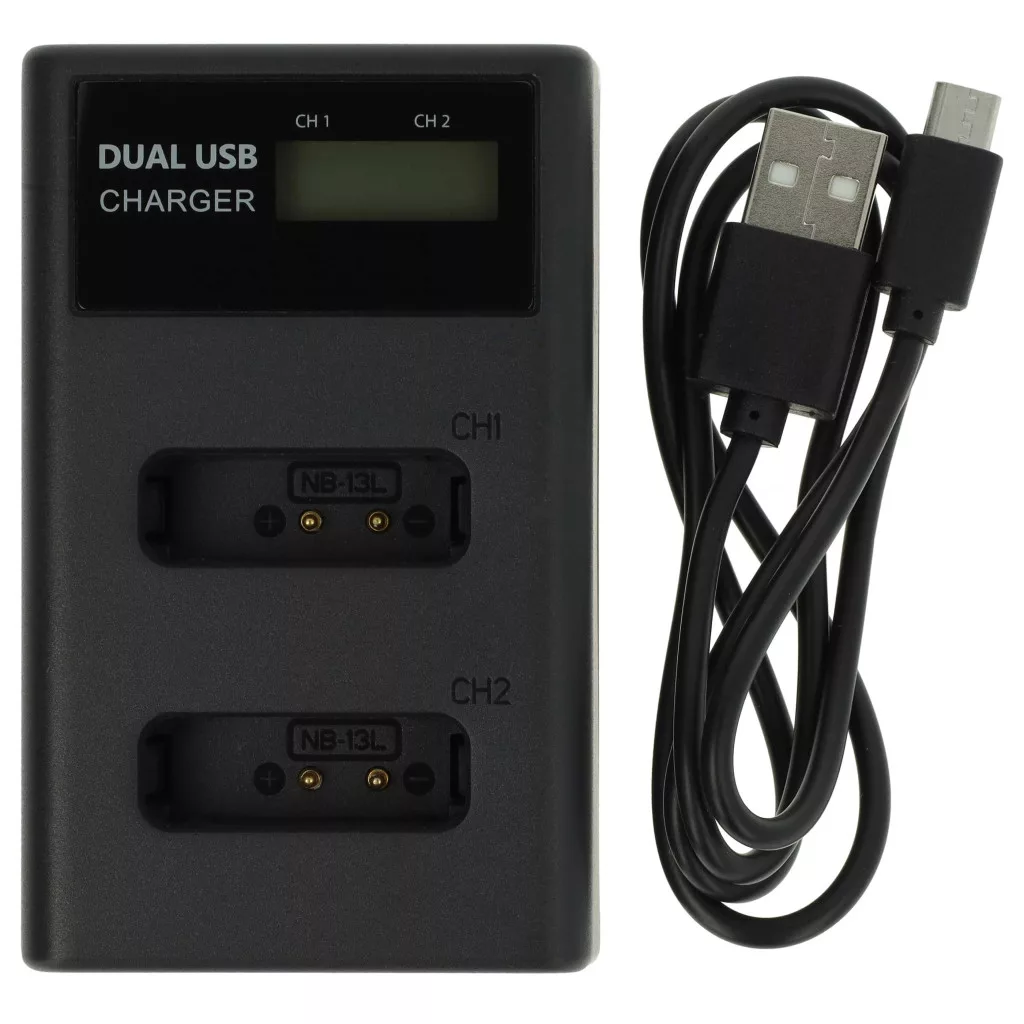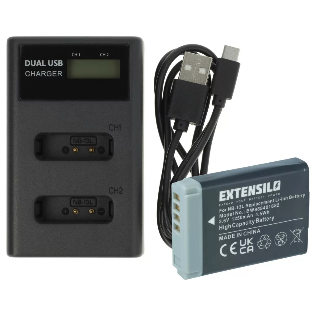 Akkumulator und Ladegerät für deine Kamera, das eine sichere und stabile Stromversorgung gewährleistet. Vollständige Funktionalität und Kompatibilität mit deiner Canon-Kamera, präzise Verarbeitung. Komplettes Ladegerät-Set, das aus einem Akku und einem Netzadapter für deine Kamera besteht. Mit diesem Set hast du alles, was du für die Vorbereitung auf das nächste Fotoshooting benötigst. Das praktische Ladegerät-Set besteht aus einem Ersatzakku und einem passenden Ladegerät. Der Akku wurde präzise für deine Kamera hergestellt, sodass er äußerst benutzerfreundlich ist. Du kannst den Akku jederzeit mit dem mitgelieferten Ladegerät aufladen. Die präzisen Anschlüsse des Ladegeräts halten den Akku fest. Leere Akkus oder wiederaufladbare Batterien gehören der Vergangenheit an! Der Inhalt des Sets: 1x Dual-Ladegerät, das bis zu 2 Akkus zuverlässig und schnell auflädt. Eingang: 5 V / 2 A, Ausgang: DC 4,2 V / 2x 0,5 A / 1x 0,7 A, Anzahl der Akkuplätze: 2, Farbe: schwarz, Kabellänge: ca. 26 cm, Anschlüsse (Ladegerät-Basis): 1x Micro-USB-Port, 1x USB-C-Port, Anschlüsse (Kabel): USB Typ A Stecker, Micro-USB, 1x Akku, Akkutyp: Li-Ion - kein Memory-Effekt, Kapazität: 1250 mAh, Spannung: 3,6 V, Energie: 4,5 Wh, Anzahl der Zellen: 1. CE- und RoHS-Zertifizierung - erfüllt alle Richtlinien zur Betriebssicherheit. Kompatible Geräte: Canon Legria Mini X, Canon PowerShot G1 X Mark II, Canon PowerShot G1X Mark III, Canon PowerShot G5 X, Canon PowerShot G5X Mark II, Canon PowerShot G7 X, Canon PowerShot G7 X Mark II, Canon PowerShot G7 X Mark III, Canon PowerShot G9 X Mark II, Canon PowerShot G9X, Canon PowerShot SX620HS, Canon PowerShot SX720HS, Canon PowerShot SX730HS, Canon PowerShot SX740HS, Canon Vixia Mini X
