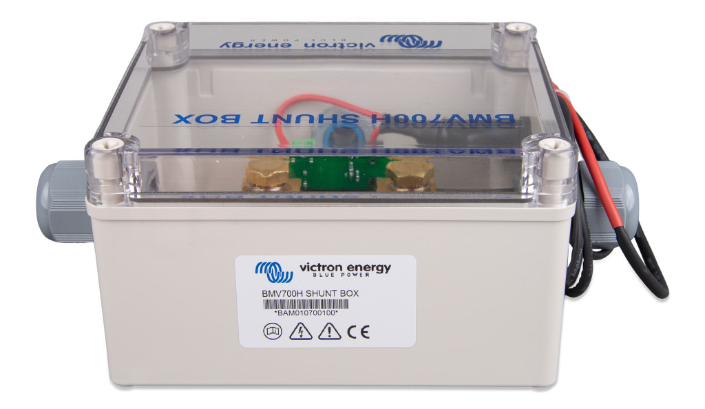 Die BMV-700H Einheit umfasst den runden Kopf, ein quadratisches Gehäuse mit Sichtfenster, einen mit Schraube versehenen Ring zur Montage, ein 10m UTP RJ12 Kabel, ein integriertes Netzkabel und einen 500A/50mV Shunt. Aufgrund der Hochspannung ist der Shunt in einem speziellen Gehäuse untergebracht.