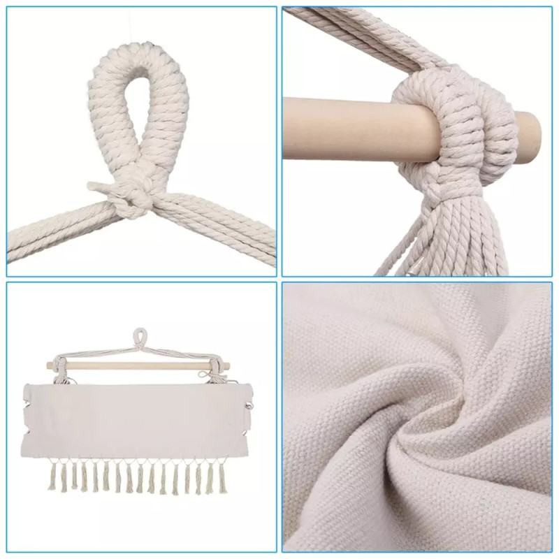 Der Hängesessel passt dank seiner neutralen beige Farbe und den dekorativen Quasten in fast jeden Stil – sei es minimalistisch, modern oder boho. Er kann im Wohnzimmer, auf der Terrasse oder im Garten verwendet werden und schafft überall eine freundliche und gemütliche Entspannungsecke.