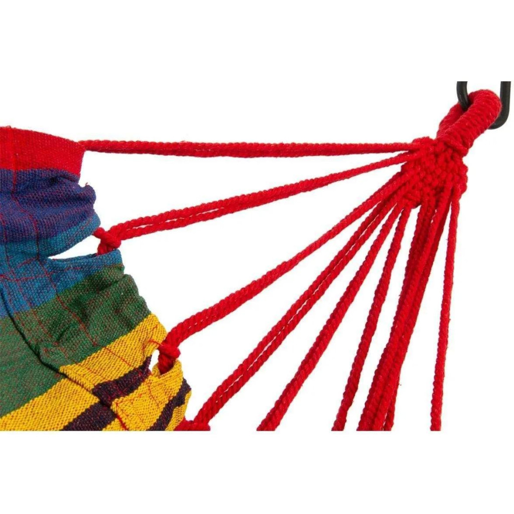 Die hängematte, die in intensiven Farben erstrahlt, bringt eine fröhliche und energetische Atmosphäre in jeden Garten oder auf jede Terrasse. Die in Rot, Gelb und Blau schimmernden Streifen sind ein Augenschmaus und machen sie zu einem echten Mittelpunkt des Ruhebereichs. Dank der lebhaften Farben ist die Hängematte nicht nur ein bequemer Ruheplatz, sondern auch ein dekoratives Accessoire.