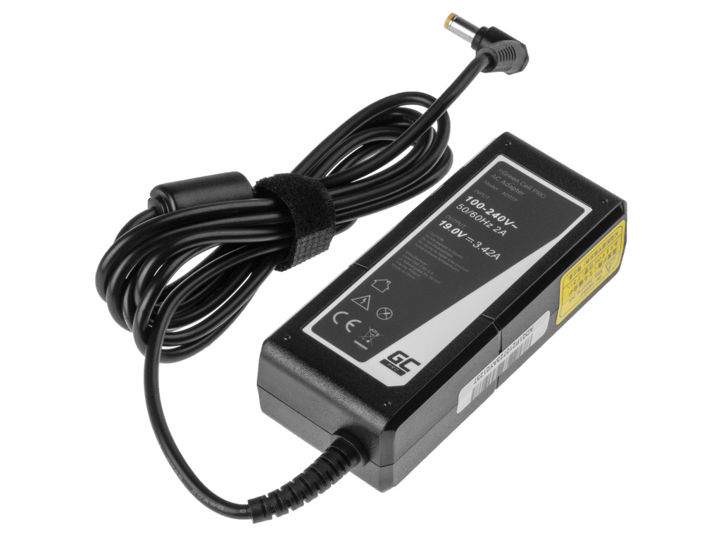 Voltage: 19V | Type: aftermarket | Warranty: 36 months | Power: 65W | Current: 3.42A | Connector size: 5.5mm-1.7mm | Power cable: Included | Overheating protection: Yes | Overvoltage protection: Yes | Condition: New | Color: Black | Product code: AD01P | Manufacturer: Green Cell