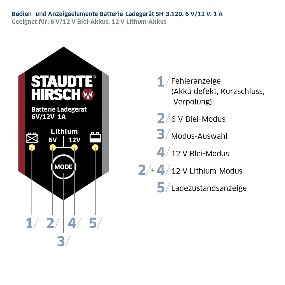 Battery Charger Staudte Hirsch SH-3.120, 6 V/12 V, 1 A Adapter cable with battery clamps Adapter cable with eyelet rings Instruction manual in DE, GB