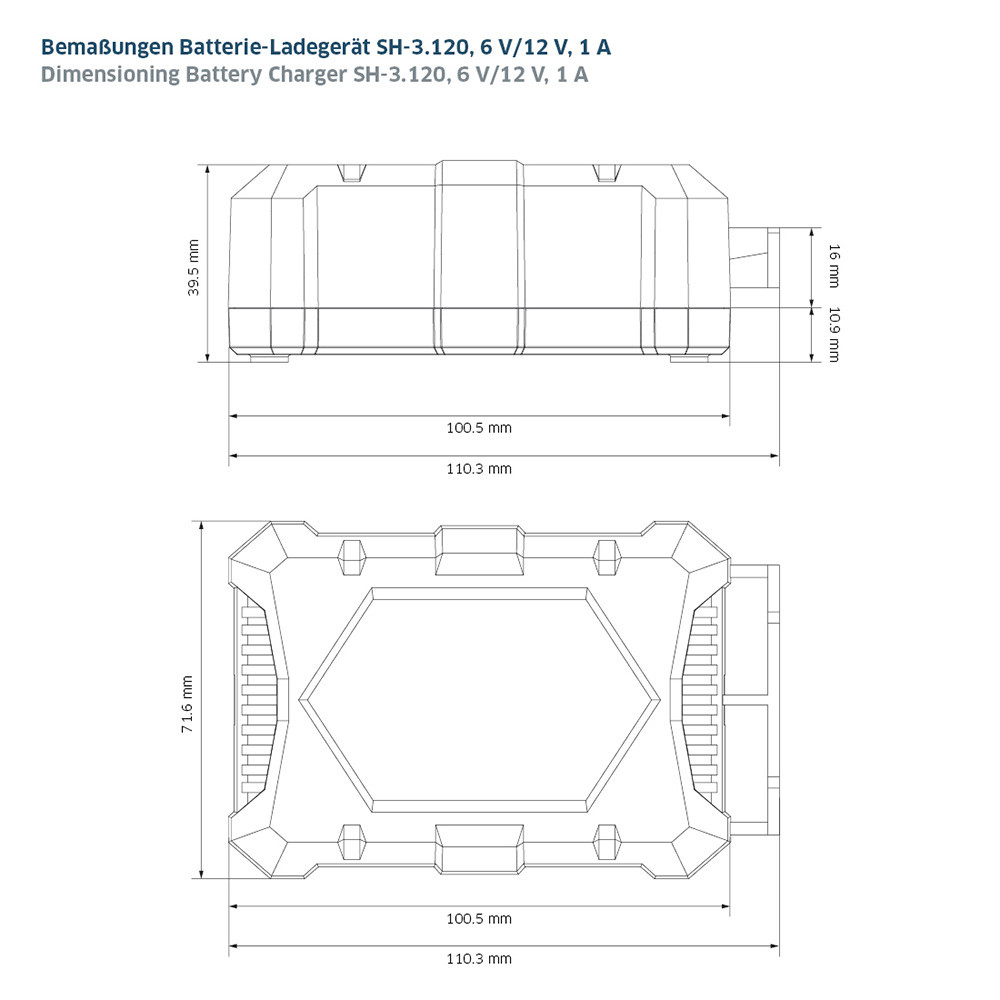 The fully automatic multi-step charging method guarantees that your battery is charged fully and gently in the shortest possible time and according to its type. Mode Specification 6 V Lead Battery type: 6 V lead-acid, lead-gel, AGM, from 1.2 Ah Charging current: 1 A Cut-off-voltage: 7.2 V 12 V Lead Battery type: 12 V lead-acid, lead-gel, AGM, from 1.2 Ah Charging current: 1 A Cut-off-voltage: 14.4 V 12 V Lithium Battery type: 12 V LiFePO 4 with BMS, from 1.2 Ah Charging current: 1 A Cut-off-voltage: 14.4 V