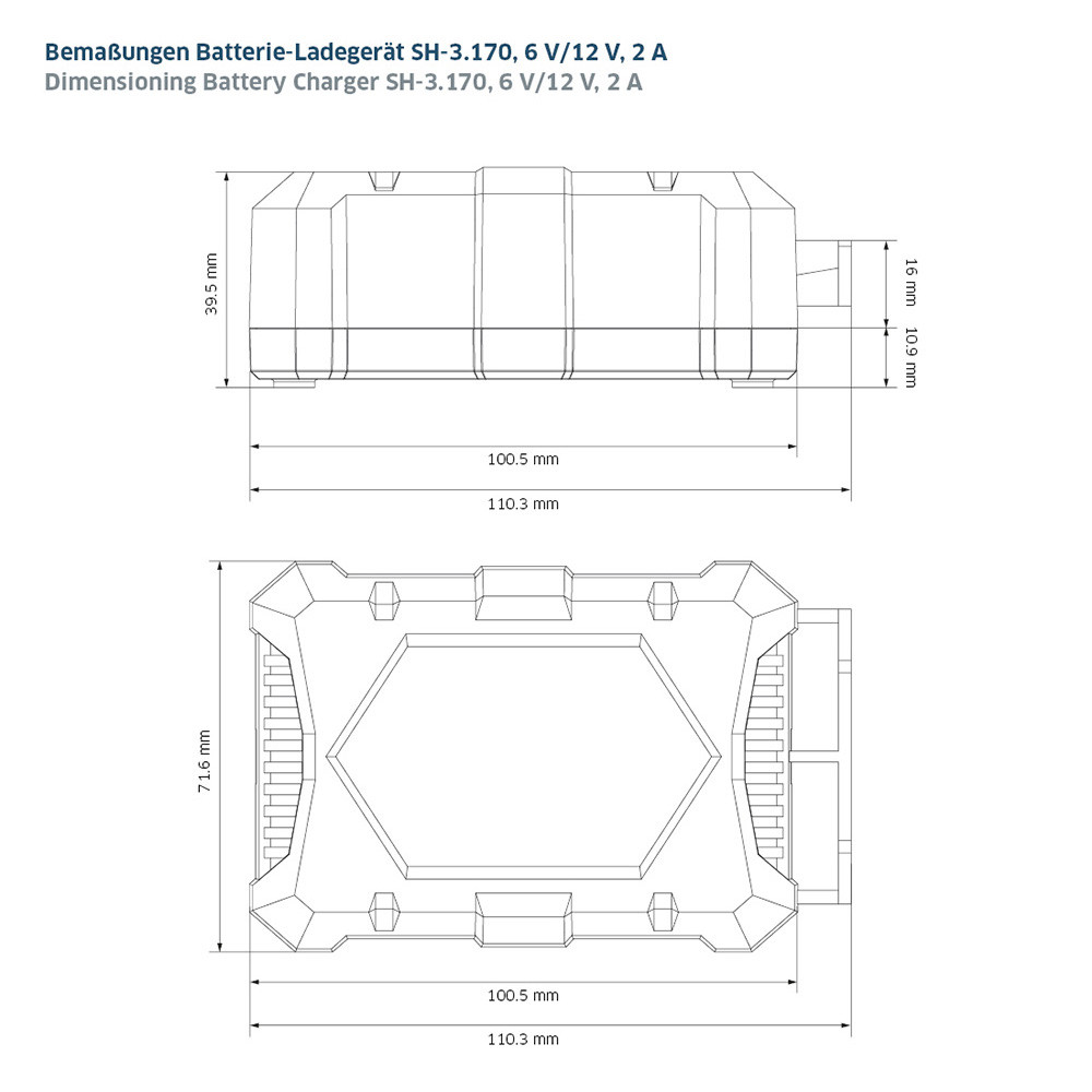 The fully automatic multi-step charging method guarantees that your battery is charged fully and gently in the shortest possible time and according to its type. Mode Specification 6 V Lead Battery type: 6 V lead-acid, lead-gel, AGM, from 2 Ah Charging current: 2 A Cut-off-voltage: 7.2 V 12 V Lead Battery type: 12 V lead-acid, lead-gel, AGM, from 2 Ah Charging current: 2 A Cut-off-voltage: 14.4 V 12 V Lithium Battery type: 12 V LiFePO 4 with BMS, from 2 Ah Charging current: 2 A Cut-off-voltage: 14.4 V