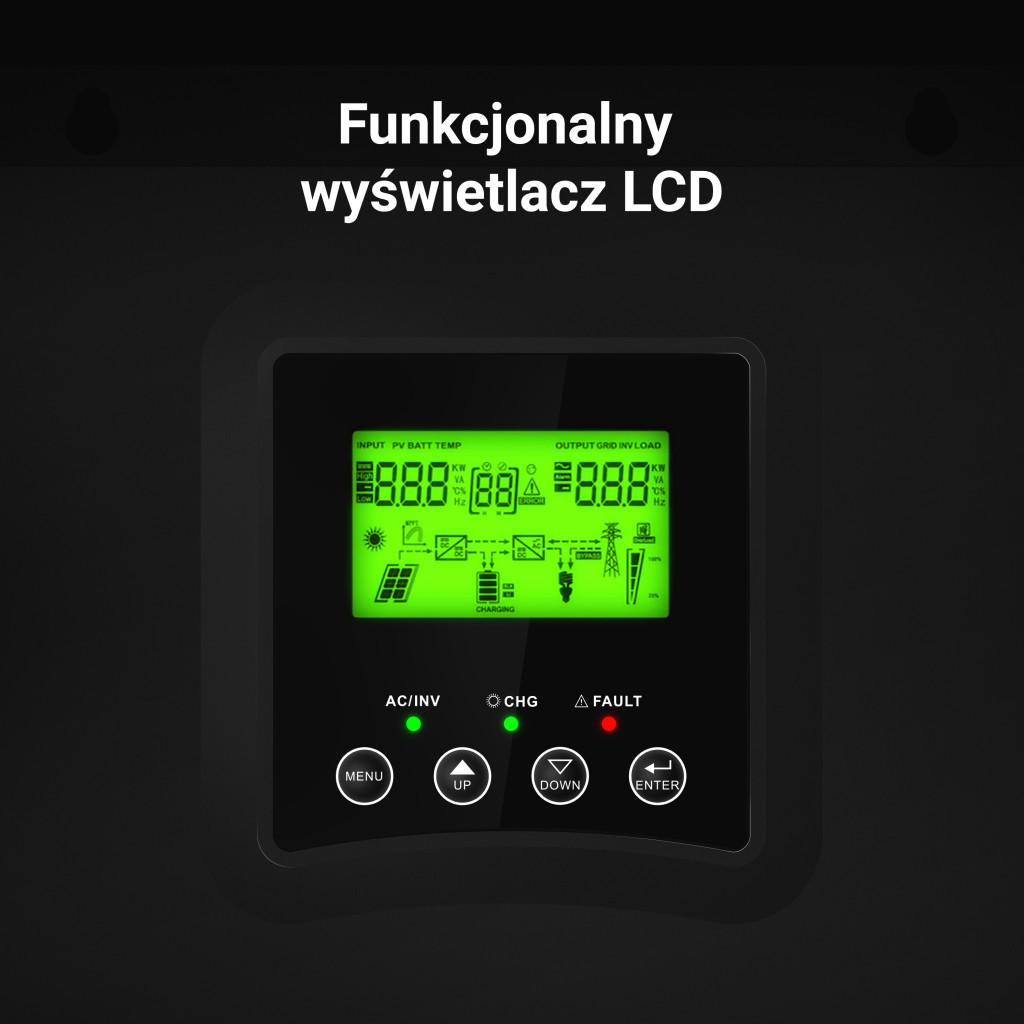 The Green Cell solar inverter is equipped with a readable, multifunctional LCD display that informs about the most important parameters of the inverter's operation and allows you to adjust the settings to both the energy installation and the individual needs of the user.