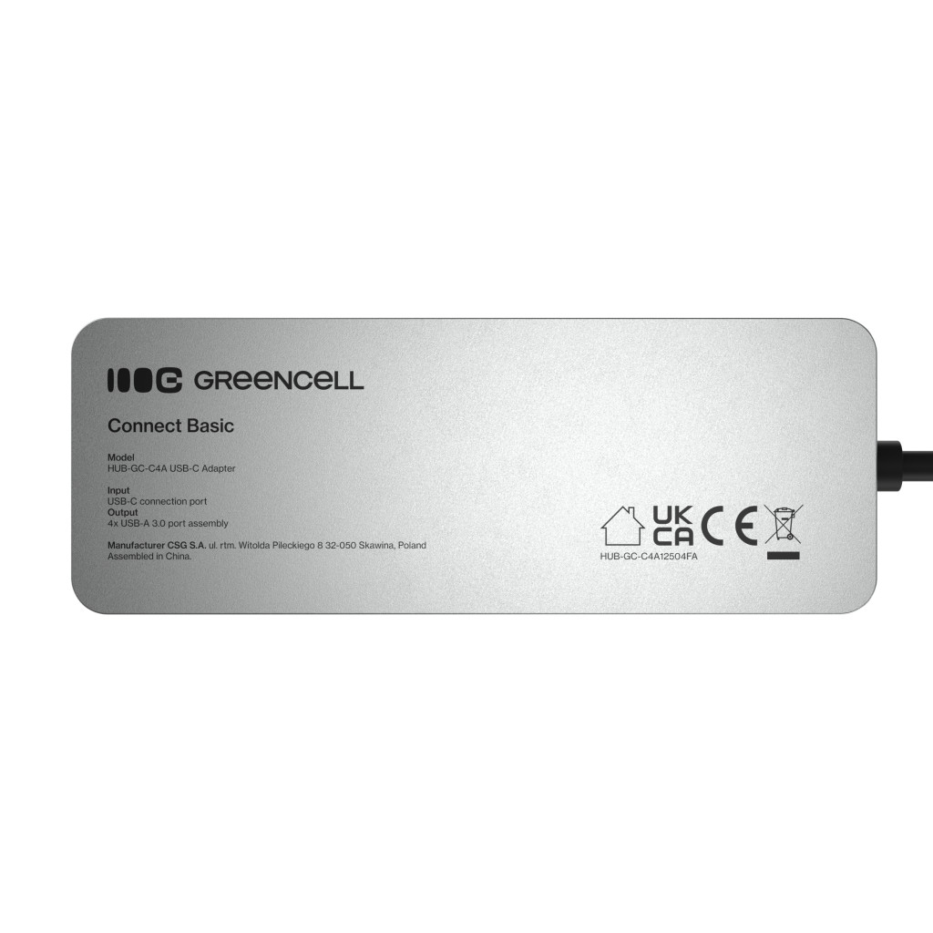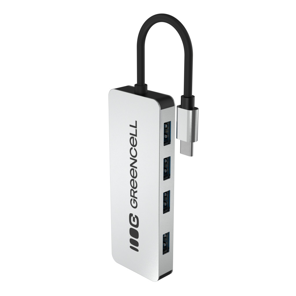 Warranty: 24 months | Color: silver | Return policy: 30 days | Product code: HUB-GC-C4A | Manufacturer: Green Cell | Size: 109 × 39.7 × 12.1 mm | Weight: 56.5 g | Certifications: 2014/30/EU EMC. 011/65/EU + 2015/863 RoHS | Input: 1× USB-C 3.0 | Output: 4× USB-A 3.0 | Built-in cable: yes (USB-C. 150 mm) | Case type: aluminum | Condition: new | Data transfer speed: up to 5 Gb/s