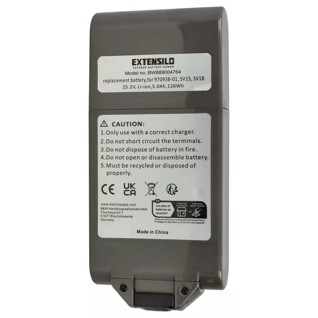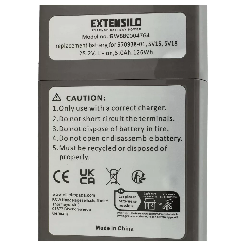 Compatible battery that breathes new life into your Dyson cleaning device. High-quality replacement part with optimal price-performance ratio. Reliable operation and full compatibility with your vacuum cleaner. Precision manufacturing for perfect fit. CE and RoHS certification - meets all operational safety directives. No memory effect. Is the battery compatible even if it has a different capacity? Yes! If the other technical specifications, such as voltage and connections, are correct, the battery is compatible. The battery capacity is measured in milliampere-hours (mAh). If the replacement battery has a higher capacity than the original, it provides longer runtime. If the capacity is only slightly higher or lower, it does not result in significant changes in runtime. You can use batteries of different capacities without any problems. High-quality Li-Ion cells for optimal device performance. Lithium-ion batteries have high energy density and are among the strongest batteries. They have a low self-discharge rate compared to NiMH batteries and are not affected by the memory effect. They do not require regular discharging, making them low maintenance. With proper storage, these rechargeable batteries are long-lasting, durable, and can withstand many charging cycles. Li-ion batteries are used in various portable devices that have high energy demands, such as smartphones, notebook computers, cameras, and power tools. These batteries can also be used in radio-controlled models and telecommunications applications. Regarding product safety: This product is manufactured in accordance with the applicable regulations of the EU. Among other things, it meets the requirements of the 2011/65/EU directive (RoHS) and the CE marking. The manufacturing complies with relevant regulations regarding product safety, environmental compatibility, and quality assurance. Compatible devices: Dyson SV15, Dyson SV17, Dyson SV18, Dyson V11, Dyson V11 2020, Dyson V11 2020 Outsize, Dyson V11 Absolute+, Dyson V11 Absolute Extra, Dyson V11 Absolute Extra +, Dyson V11 Absolute Extra Pro, Dyson V11 Animal, Dyson V11 Click-In, Dyson V11 Complete Extra, Dyson V11 Fluffy Extra, Dyson V11 Torque Drive Extra, Dyson V11 Torque Size, Dyson V15, Dyson V15 Detect, Dyson V15 Detect Absolute Extra, Dyson V15 Detect Total Clean SV22, Dyson V15s Submarine