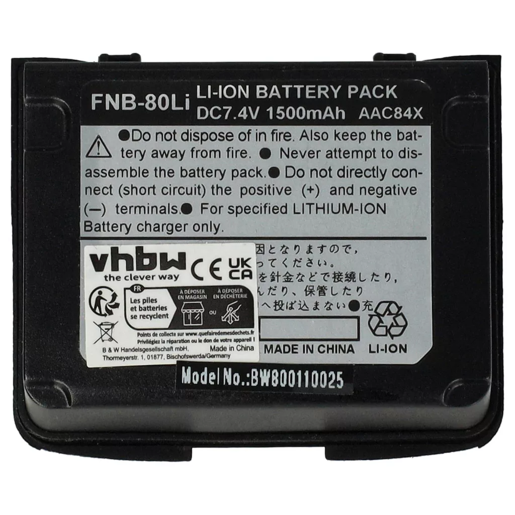 Compatible batteries that breathe new life into your Vertex Yaesu CB radio. High-quality spare parts with optimal price-performance ratio. Reliable operation and full compatibility with your radio device. Another back cover is required (included in delivery). Precise manufacturing for a perfect fit. CE and RoHS certification - meets all operational safety guidelines. No memory effect. High-quality Li-Ion cells for optimal device performance. Lithium-ion batteries have high energy density and are among the strongest batteries. Compared to NiMH batteries, they have a low self-discharge rate and do not suffer from memory effect. They do not require regular discharging, making them low maintenance. With proper storage, these rechargeable batteries are long-lasting, durable, and have a high charge cycle count. Li-ion batteries are used in various portable devices that have high energy demands, such as smartphones, notebook computers, cameras, and power tools. These batteries can also be used in radio-controlled models and telecommunications applications. Compatible devices: Vertex Yaesu VX-5R, Vertex Yaesu VX-7R, Vertex Yaesu VX5R, Vertex Yaesu VX7R