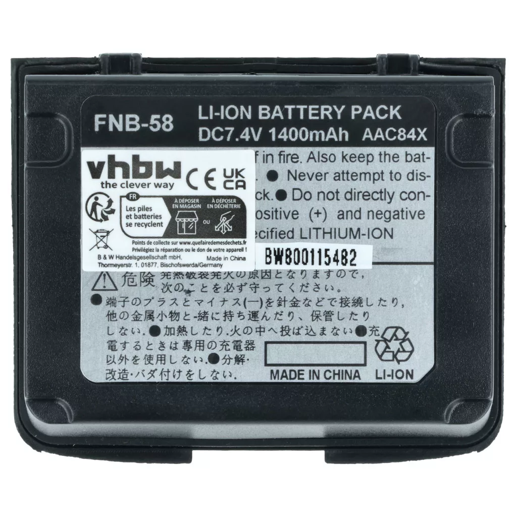 Compatible devices: Horizon HX460, Horizon HX460S, Horizon HX470S, Horizon HX471, Horizon HX471S, Horizon HX471SB, Horizon HX471SS, Vertex Yaesu VX-5E, Vertex Yaesu VX-5R, Vertex Yaesu VX-5RS, Vertex Yaesu VX-6, Vertex Yaesu VX-6E, Vertex Yaesu VX-6R, Vertex Yaesu VX-7E, Vertex Yaesu VX-7R, Vertex Yaesu VX-7RB, Vertex Yaesu VXA-700, Vertex Yaesu VXA-710, Yaesu Vertex FNB-58, Yaesu Vertex FNB-58Li, Yaesu Vertex FNB-80, Yaesu Vertex FNB-80Li