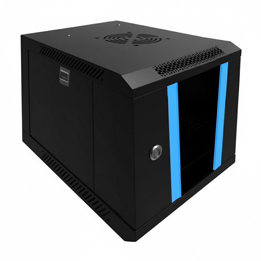 The clearly readable 6U marking on the vertical rails aids in quick and precise device installation. The rack cabinet has a width of 280 mm and a depth of 310 mm, which is ideal for the secure, organized, and compact placement of smaller network devices.