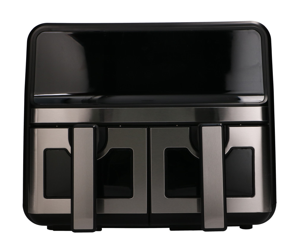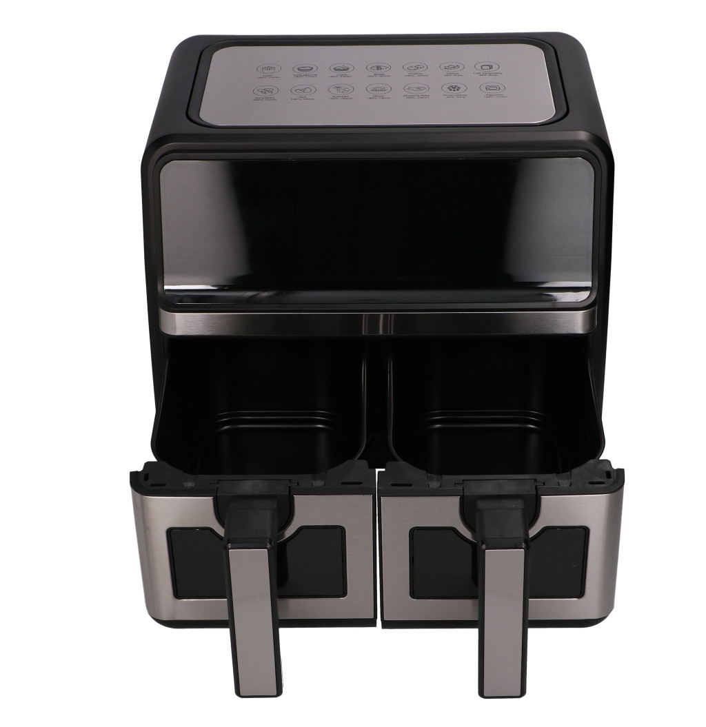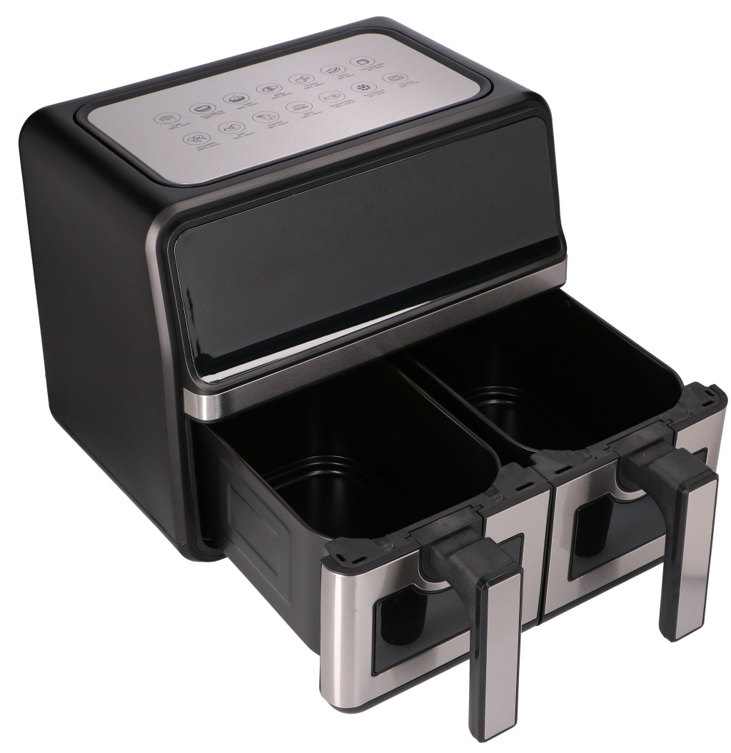 Discover the experience of healthier frying with this high-capacity, 9-liter, 2200 W hot air fryer. Thanks to the two separate drawer baskets, you can prepare meals simultaneously yet separately, saving time and energy. You can create crispy on the outside and juicy on the inside dishes with minimal oil usage. Its modern black design is an elegant addition to any kitchen, and its easy-to-clean surface simplifies everyday use.