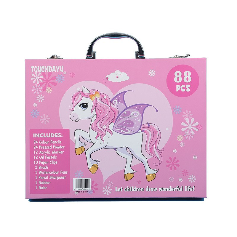 Ez a színes, 88 darabos kreatív csomag ideális választás minden olyan gyermek számára, aki szeret rajzolni, festeni és alkotni. A praktikus, rózsaszín unikornis formájú tok nemcsak figyelemfelkeltő, hanem jól rendszerezi az összes rajzeszközt, így a kis művészek bárhová magukkal vihetik saját mini stúdiójukat.